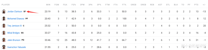 克拉克森全场比赛23分钟,13中5,三分6中2,拿到13分3篮板3助攻2抢断2失误,命中率38.5%,三分命中率33.3%,正负值-13。