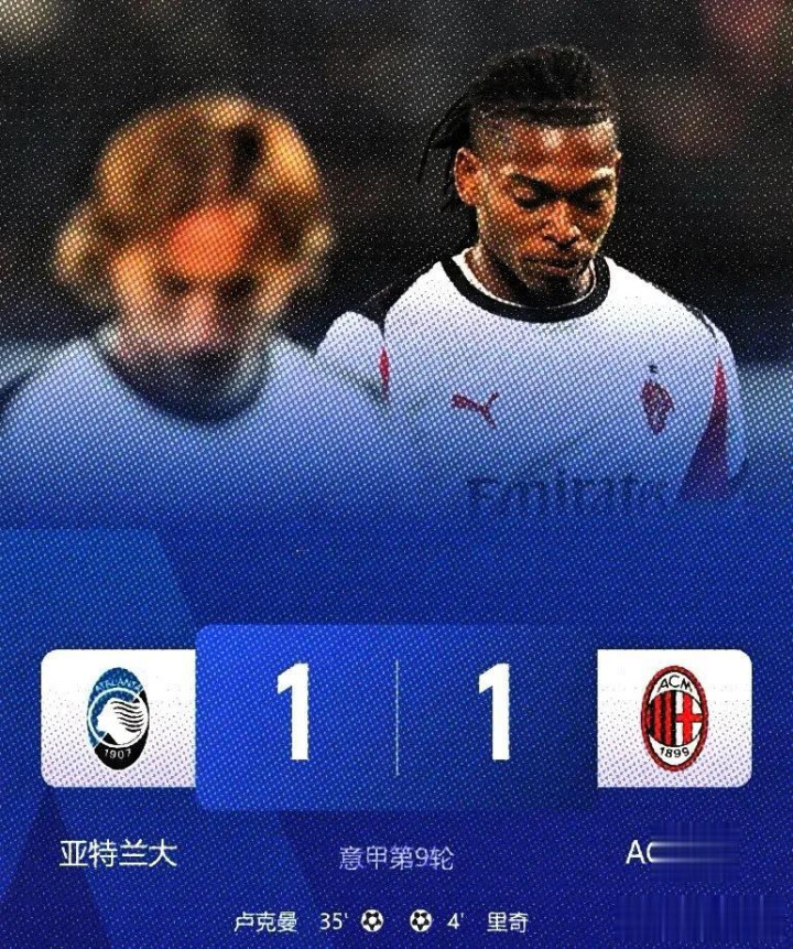 AC米兰在意甲联赛客场对阵亚特兰大,AC米兰球员里奇在第4分钟远射,球经防守球员身体折射进入网窝。亚特兰大球员卢克曼在第35分钟射门得分,将比分扳平。亚特兰大球员扎帕科斯塔在比赛后期射门,AC米兰守门员迈尼昂移动位置将球扑出底线。比赛以1-1比分结束,AC米兰在积分榜上与榜首差距扩大。