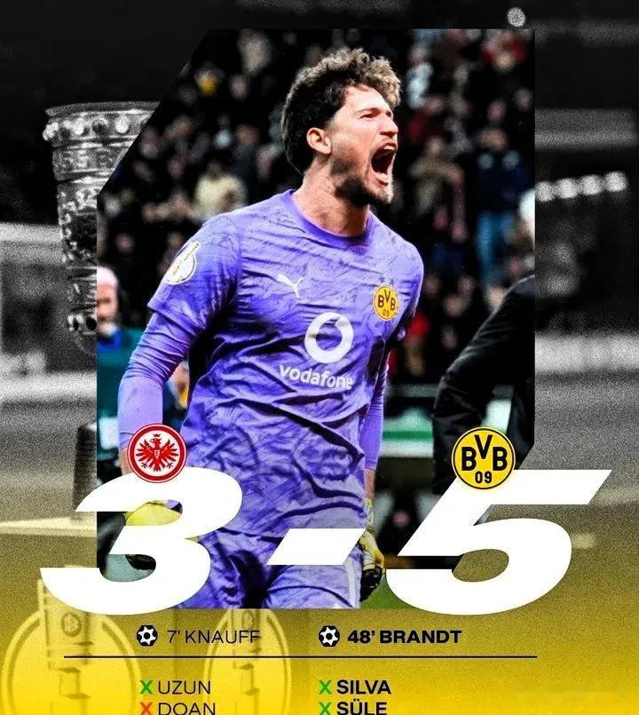 多特蒙德在德国杯第2轮对阵法兰克福,法兰克福球员克瑙夫在第7分钟形成单刀射门得分。多特蒙德球员布兰特在第48分钟门前包抄射门将比分扳平。比赛进入点球阶段,法兰克福球员堂安律射门击中门柱飞出,沙伊比射门被多特蒙德守门员扑出。多特蒙德四名球员依次射门,球全部进入网内。总比分5-3,多特蒙德晋级。点球射失和扑救显示高压环境下心理稳定性,守门员动作影响决定性时刻。