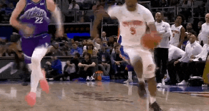 第二节比赛中,霍兰德迎面残暴大帽乔治,再反击上演双手滑翔飞扣。