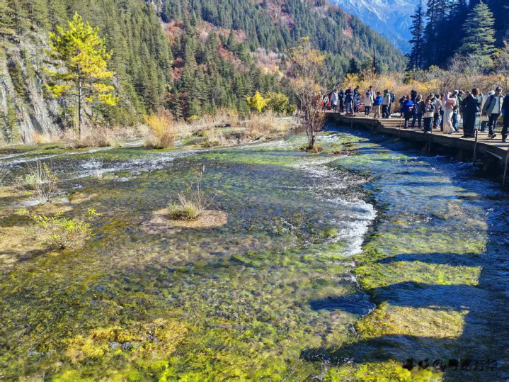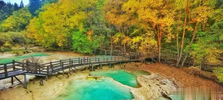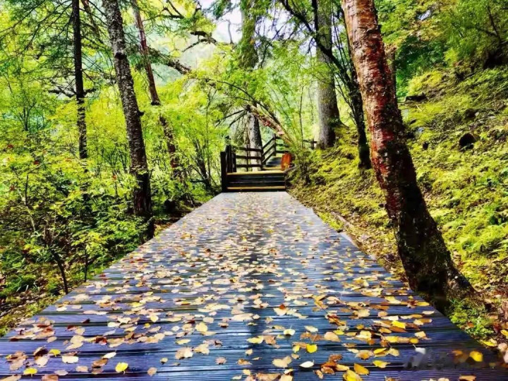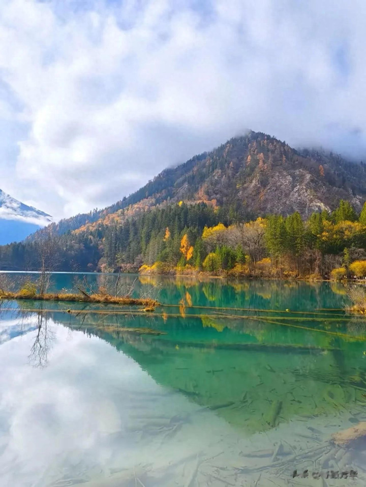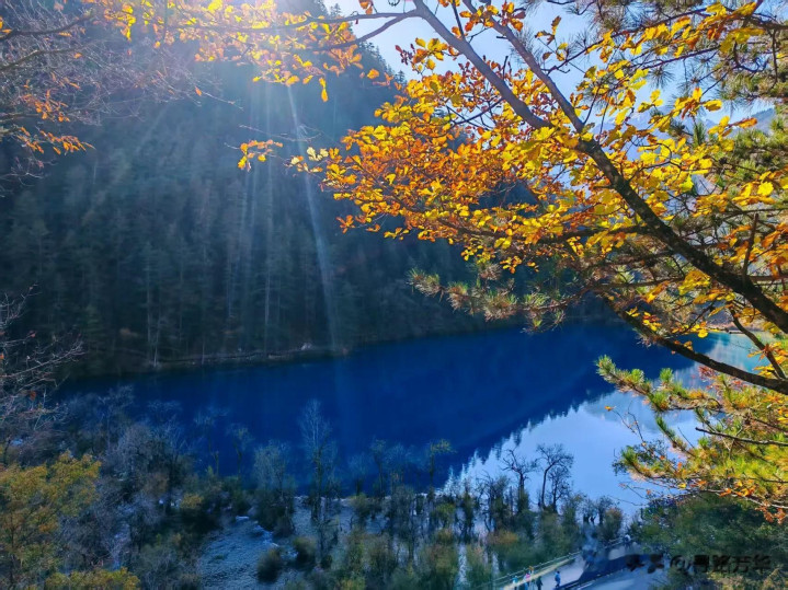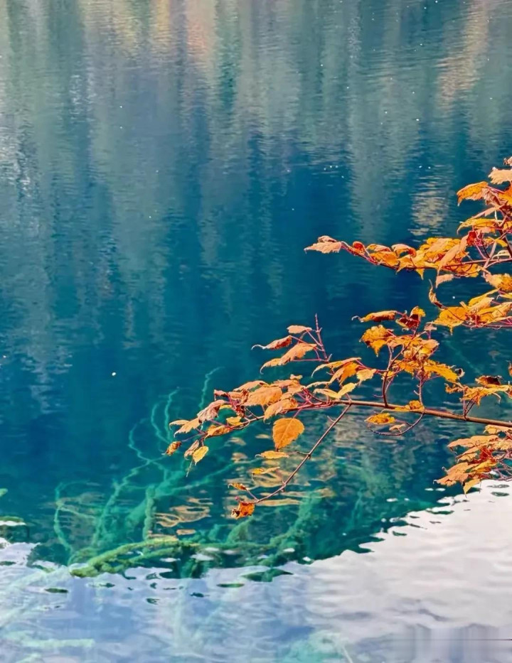 我们踏上了蜿蜒于林间的木质栈道。栈道上,落满了各式各样的叶子,厚厚的,像一层柔软的地毯。脚踩上去,发出“咯吱、咯吱”的细微声响,在这寂静里,竟显得分外清晰而悦耳。当我转过一个弯,猛然望见一个深秋的海子如此碧绿、又如此蔚蓝地呈现在眼前时,我几乎要屏住呼吸。我怔怔地注视着那湖面,竟久久不愿离去。湖水是那般沉静,那般通透,宛如一大块凝固了的、凉沁沁的碧玉。水边一棵树的倒影,清晰地印在水中,树上的叶子或黄或红,在水里也成了另一个斑斓的世界,真实与虚幻的界限,在这一刻模糊了。我仿佛也成了那水中的一棵树,愿将魂灵沉浸在这无边的碧色里。